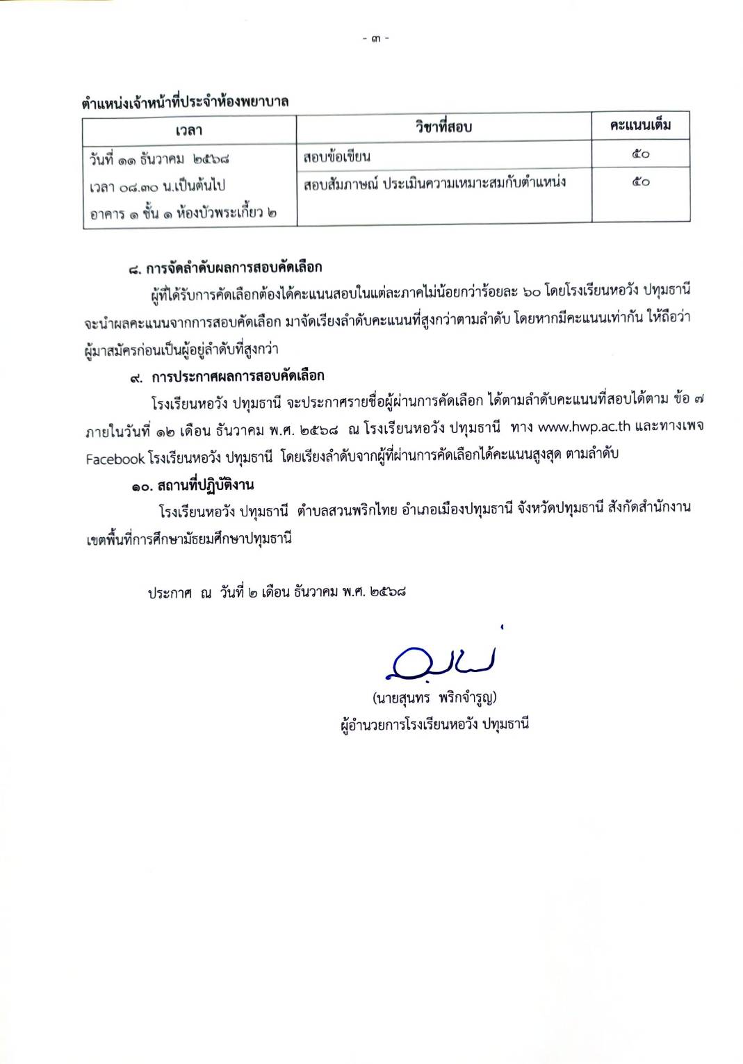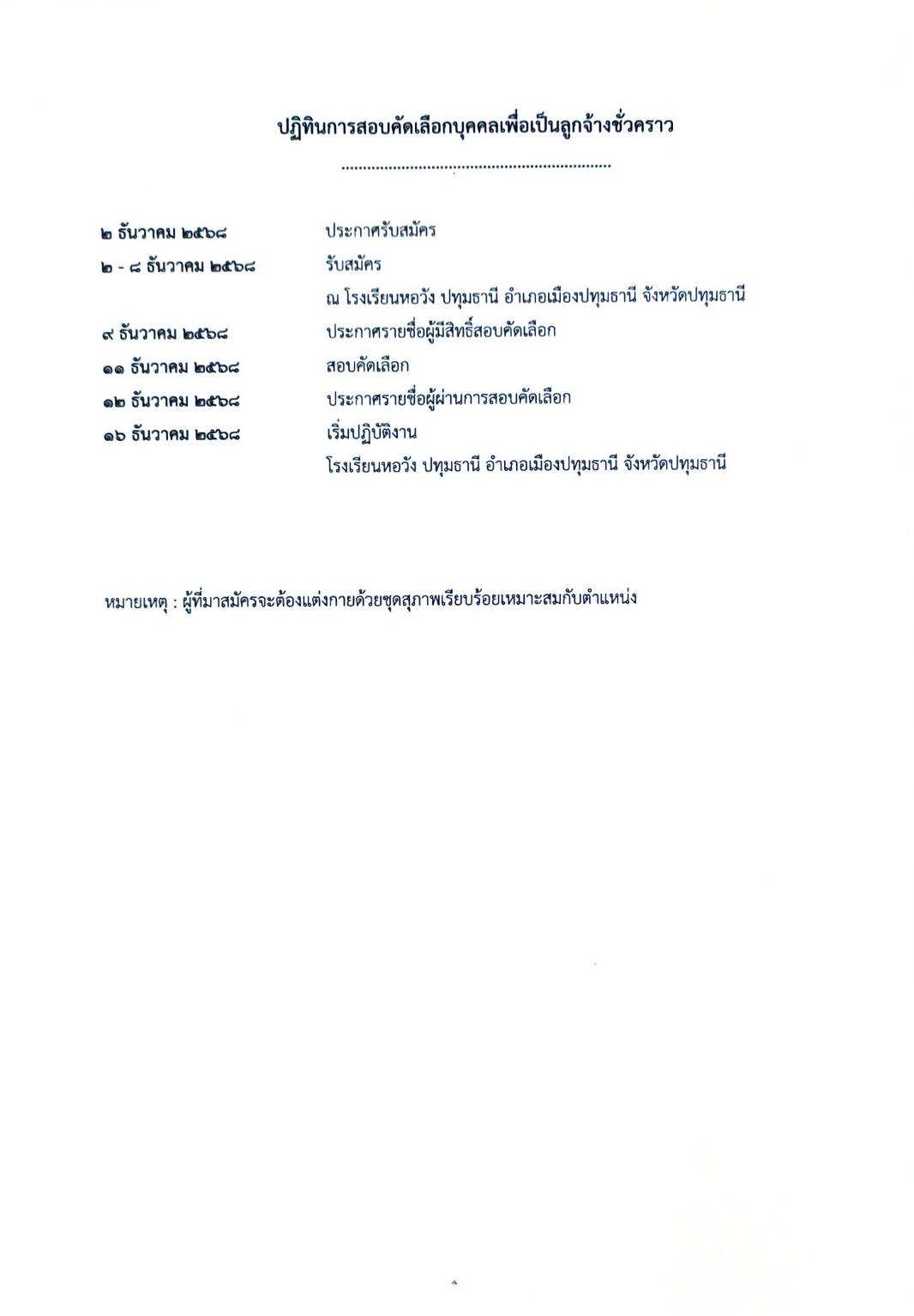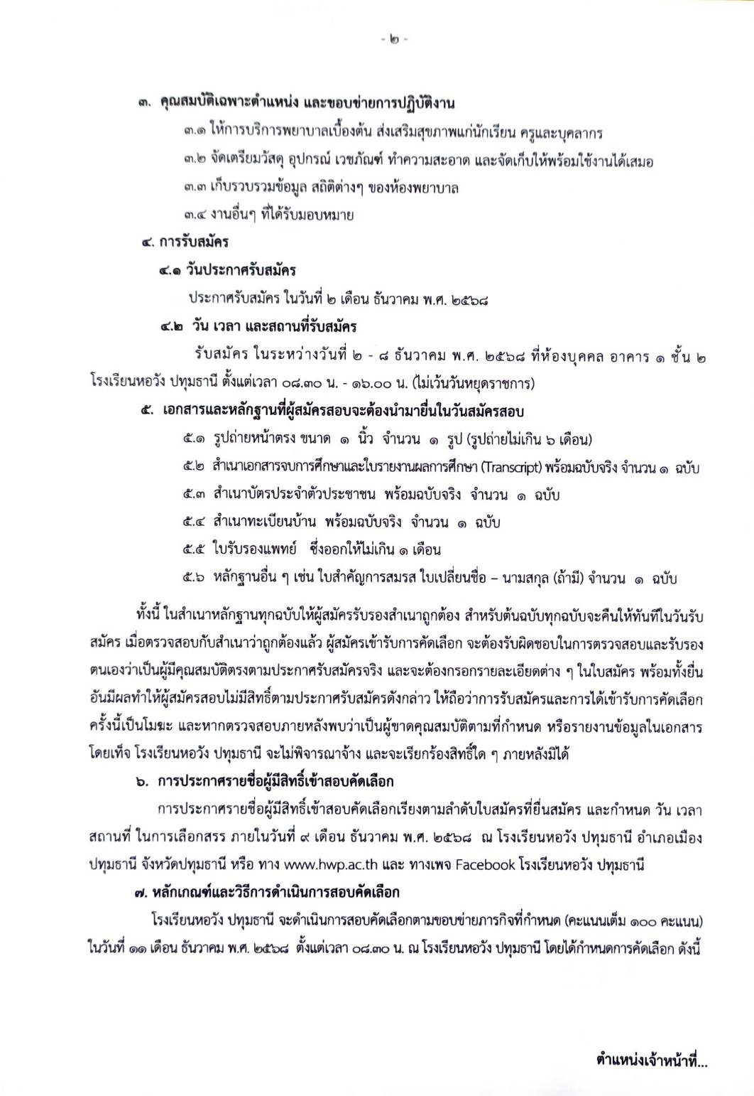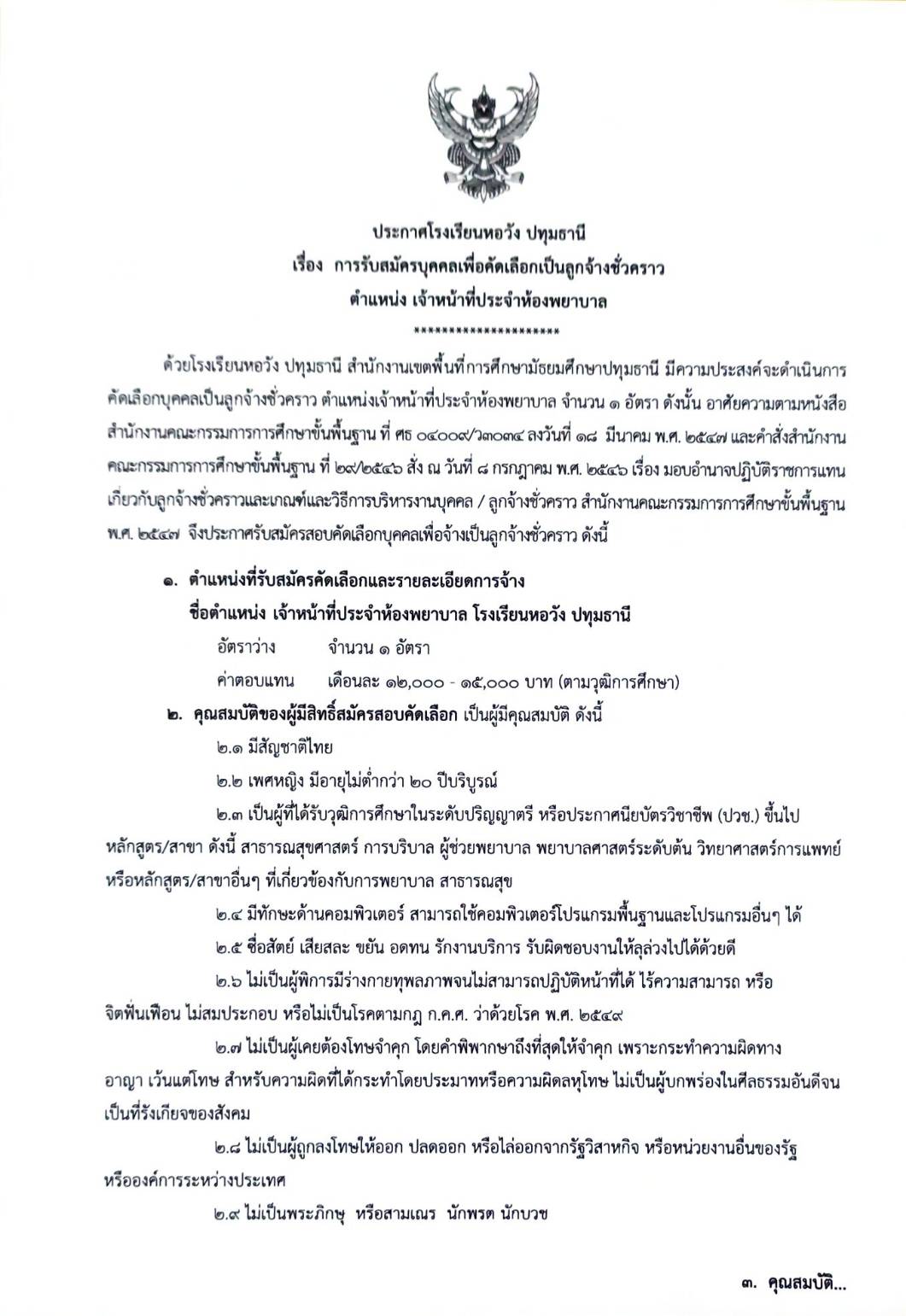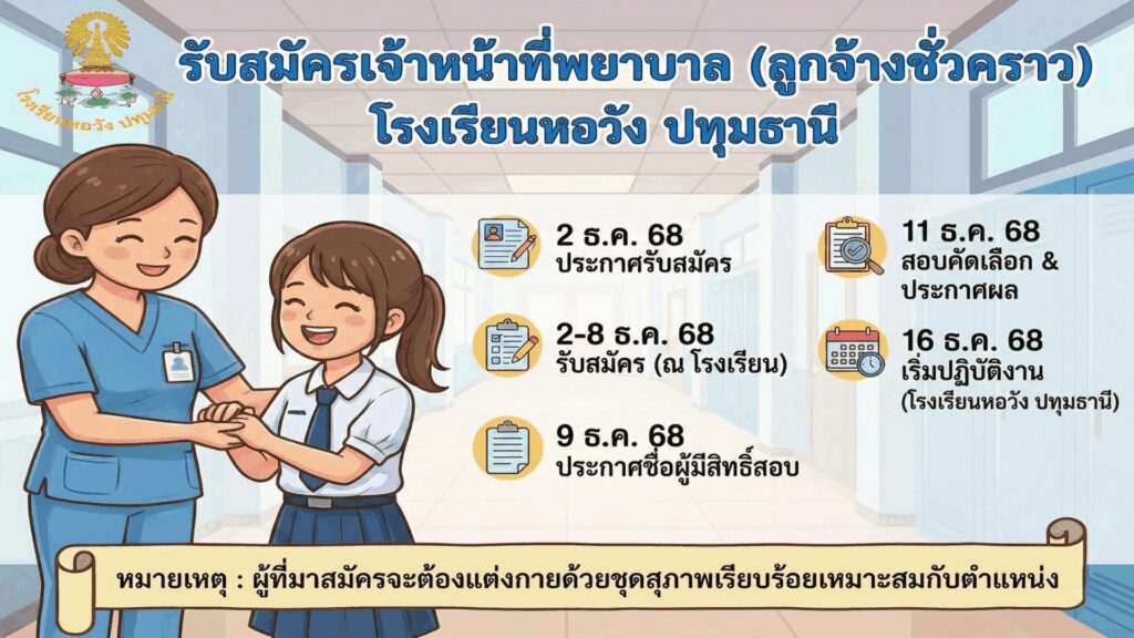 วันที่ 2 ธันวาคม 2568 โรงเรียนหอวัง ปทุมธานี สํานักงานเขตพื้นที่การศึกษามัธยมศึกษาปทุมธานี มีความประสงค์จะดําเนินการ คัดเลือกบุคคลเป็นลูกจ้างชั่วคราว ตําแหน่ง เจ้าหน้าที่ประจําห้องพยาบาล จํานวน 1 อัตรา ดังนั้น อาศัยความตามหนังสือ สํานักงานคณะกรรมการการศึกษาขั้นพื้นฐาน ที่ ศธ 04009/13034 ลงวันที่ 18 มีนาคม พ.ศ. 2547 และคําสั่ง สํานักงานคณะกรรมการการศึกษาขั้นพื้นฐาน ที่ 29/2546 สั่ง ณ วันที่ 4 กรกฎาคม พ.ศ. 2546 เรื่อง มอบอํานาจ ปฏิบัติราชการแทนเกี่ยวกับลูกจ้างชั่วคราวและเกณฑ์และวิธีการบริหารงานบุคคล / ลูกจ้างชั่วคราว สํานักงาน คณะกรรมการการศึกษาขั้นพื้นฐาน พ.ศ. 2547 จึงประกาศรับสมัครสอบคัดเลือกบุคคลเพื่อจ้างเป็นลูกจ้างชั่วคราว รายละเอียดดังเอกสารแนบ