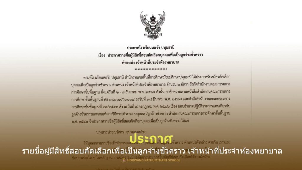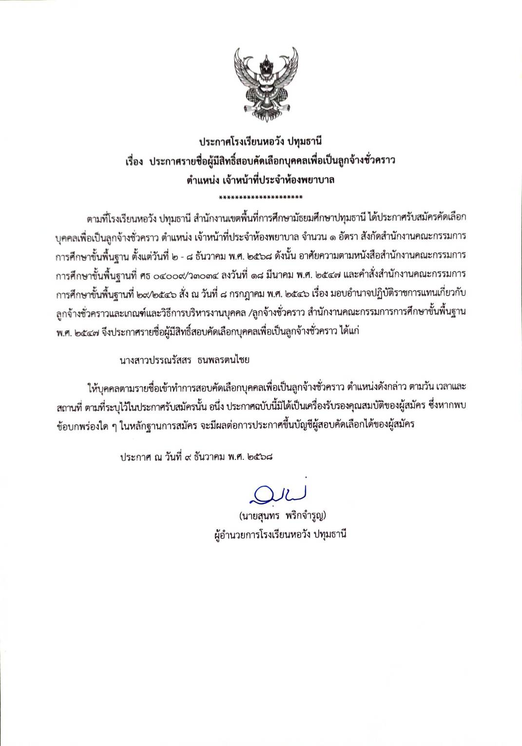 วันที่ ๙ ธันวาคม ๒๕๖๘ ตามที่โรงเรียนหอวัง ปทุมธานี สํานักงานเขตพื้นที่การศึกษามัธยมศึกษาปทุมธานี ได้ประกาศรับสมัครคัดเลือก บุคคลเพื่อเป็นลูกจ้างชั่วคราว ตําแหน่ง เจ้าหน้าที่ประจําห้องพยาบาล จํานวน ๑ อัตรา สังกัดสํานักงานคณะกรรมการ การศึกษาขั้นพื้นฐาน ตั้งแต่วันที่ ๒ – ๔ ธันวาคม พ.ศ. ๒๕๖๘ ดังนั้น อาศัยความตามหนังสือสํานักงานคณะกรรมการ การศึกษาขั้นพื้นฐานที่ ศธ ๐๔๐๐๙/๑๓๐๓๔ ลงวันที่ ๑๘ มีนาคม พ.ศ. ๒๕๔๗ และคําสั่งสํานักงานคณะกรรมการ การศึกษาขั้นพื้นฐานที่ ๒๙/๒๕๔๖ สั่ง ณ วันที่ 4 กรกฎาคม พ.ศ. ๒๕๔๖ เรื่อง มอบอํานาจปฏิบัติราชการแทนเกี่ยวกับ ลูกจ้างชั่วคราวและเกณฑ์และวิธีการบริหารงานบุคคล /ลูกจ้างชั่วคราว สํานักงานคณะกรรมการการศึกษาขั้นพื้นฐาน พ.ศ. ๒๕๔๗ จึงประกาศรายชื่อผู้มีสิทธิ์สอบคัดเลือกบุคคลเพื่อเป็นลูกจ้างชั่วคราว ได้แก่