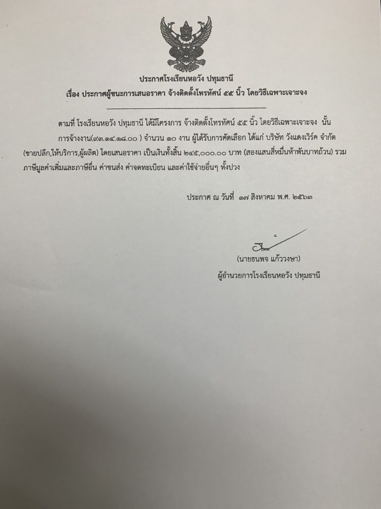 ประกาศผู้ชนะการเสนอราคา จ้างติดตั้งโทรทัศน์ 54 นิ้ว โดยวิธีเฉพาะเจาะจง