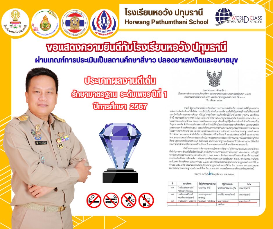 โรงเรียนหอวังปทุมธานี ผ่านเกณฑ์การประเมินเป็นสถานศึกษาสีขาว ปลอดยาเสพติดและอบายมุข