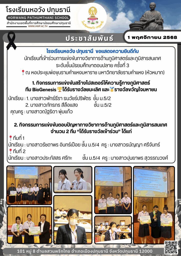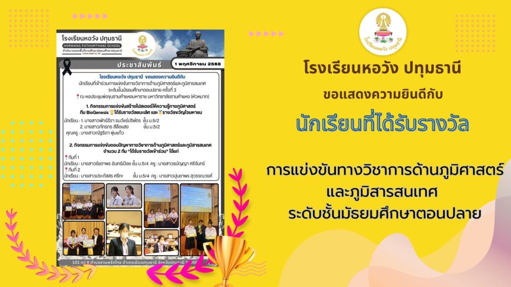 โรงเรียนหอวัง ปทุมธานี ขอแสดงความยินดีกับ นักเรียนที่เข้าร่วมการแข่งขันทางวิชาการด้านภูมิศาสตร์และภูมิสารสนเทศ ระดับชั้นมัธยมศึกษาตอนปลาย ครั้งที่ 3 ณ หอประชุมพ่อขุนรามคําแหงมหาราช มหาวิทยาลัยรามคําแหง (หัวหมาก)