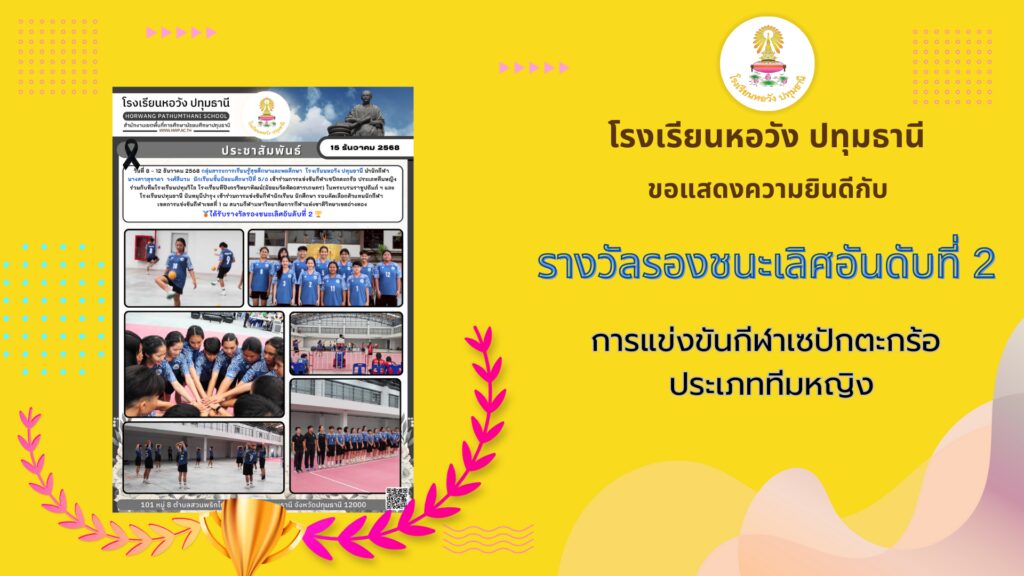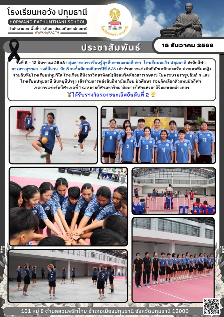 วันที่ 8 – 12 ธันวาคม 2568 กลุ่มสาระการเรียนรู้สุขศึกษาและพลศึกษา โรงเรียนหอวัง ปทุมธานี นำนักกีฬานางสาวสุชาดาวงศ์สีนวนนักเรียนชั้นมัธยมศึกษาปีที่ 5/6 เข้าร่วมการแข่งขันกีฬาเซปักตะกร้อ ประเภททีมหญิง ร่วมกับทีมโรงเรียนปทุมวิไล โรงเรียนทีปังกรวิทยาพัฒน์(มัธยมวัดหัตถสารเกษตร) ในพระบรมราชูปถัมภ์ ฯ และโรงเรียนปทุมธานี นันทมุนีบำรุง เข้าร่วมการแข่งขันกีฬานักเรียน นักศึกษา รอบคัดเลือกตัวแทนนักกีฬาเขตการแข่งขันกีฬาเขตที่ 1 ณ สนามกีฬามหาวิทยาลัยการกีฬาแห่งชาติวิทยาเขตอ่างทอง